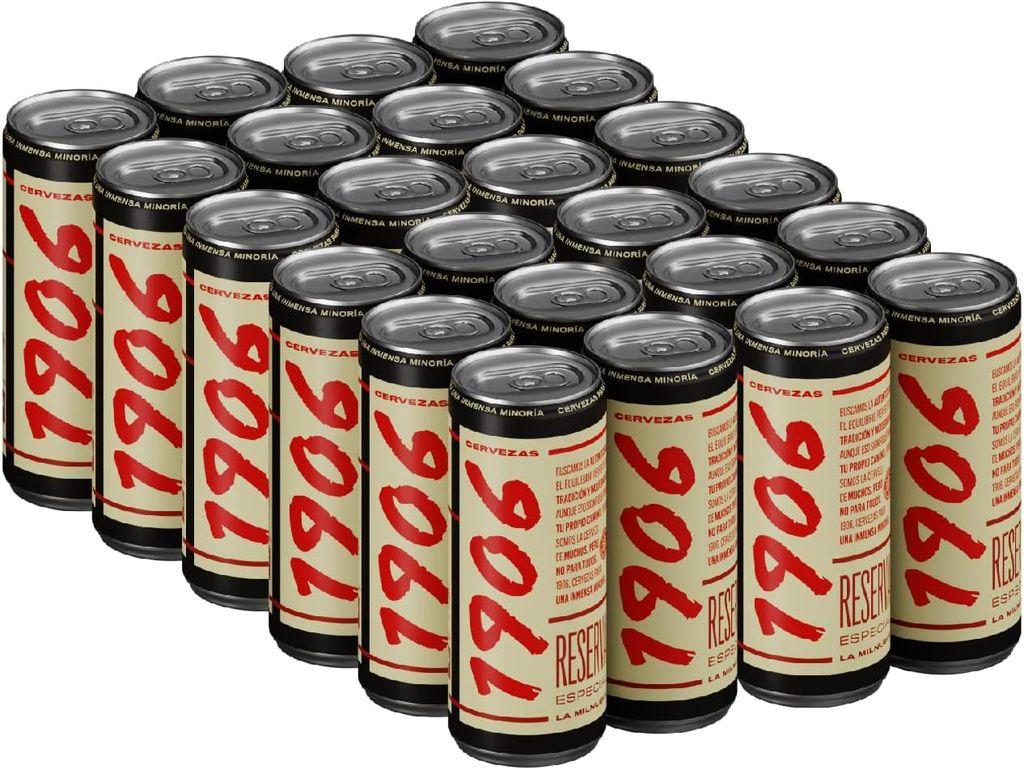 1906 Reserva Especial - Cerveza Lager Extra, Pack de 24 Latas x 33 cl, Sabor y Aroma Tostado, Galardonada Internacionalmente, 6,5% Volumen de Alcohol, El embalaje puede variar