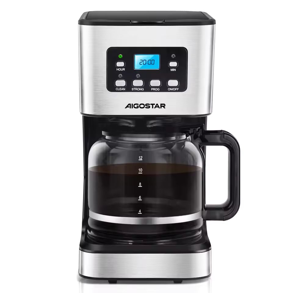 Aigostar Darcy X - Cafetera de Goteo con Temporizador Programable, 950W,1.5L(12 Tazas),Pantalla LCD, Filtro Reutilizable, Auto Apagado, Función Mantener Caliente. Función Auto Limpieza (Descalcificación)