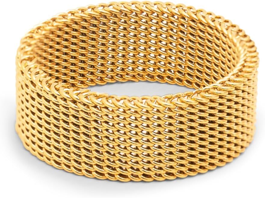 SINGULARU - Anillo Mesh. Acero con Acabado en Baño Oro de 18Kt. Anillo Ancho y Maxi con Altura de 8 mm y Grosor de 1.9 mm. Joyas para Mujer. Talla 10 a 16