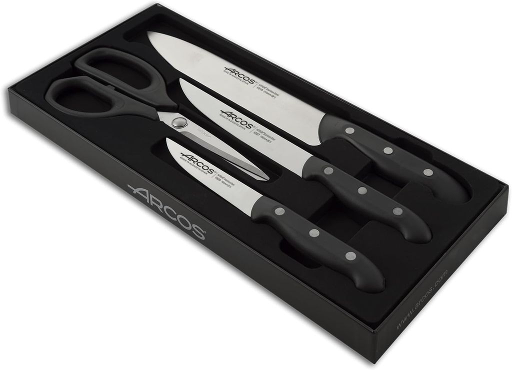 Renovar los utensilios de corte es uno de los cambios que más se agradecen en la cocina diaria. Este juego de la serie Maitre de Arcos ofrece una solución integral para las necesidades básicas de cualquier cocinero aficionado o profesional. El set consta de cuatro piezas esenciales: tres cuchillos de chef de diferentes tamaños y utilidades (generalmente un cuchillo de cocina, uno para verduras y otro de mayor envergadura) y unas tijeras de cocina polivalentes. Esta combinación te permite abordar desde el pelado de frutas pequeñas hasta el troceado de carnes y pescados con total solvencia.