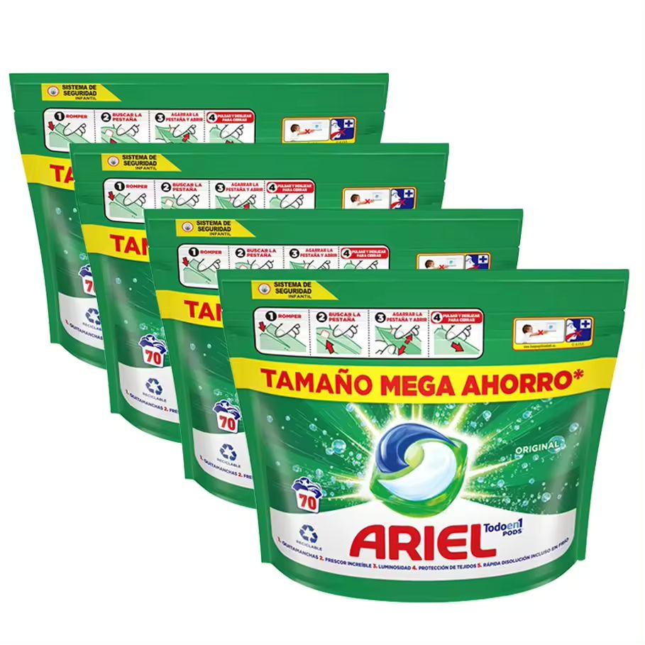 La revolución en la lavandería llegó con las cápsulas, y este Mega Pack de Ariel Todo En 1 Pods lleva la comodidad y el ahorro al siguiente nivel. Con un total de 280 cápsulas divididas en 4 formatos de 70 lavados, este producto está pensado para que te olvides de comprar detergente durante meses, o incluso un año entero dependiendo de tu frecuencia de lavado. Las cápsulas eliminan la necesidad de medir y verter líquidos o polvos, evitando derrames y asegurando que siempre usas la dosis exacta y necesaria, ni más ni menos. Esto no solo es práctico, sino que evita el desperdicio de producto y dinero.