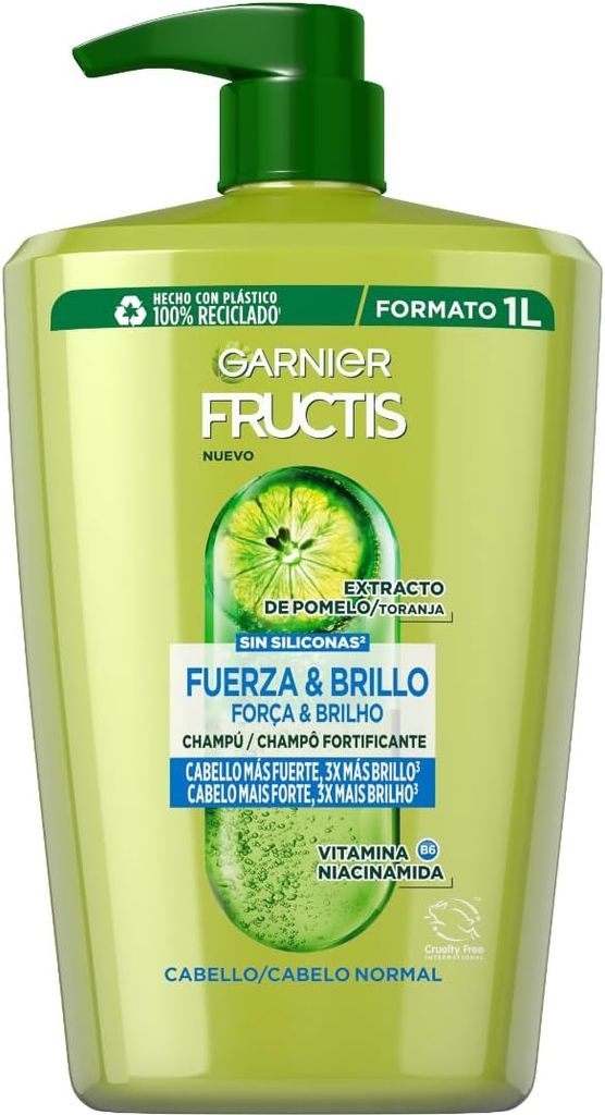 Garnier Fructis Shampoo Frueza & Brillo XXL con Vitamina B6, Niacinamida y Extracto de Pomelo para un cabello más fuerte y brillante, 1000ml