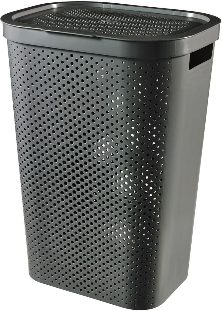 Mantén la zona de lavado ordenada con este contenedor de 60 litros pensado para grandes acumulaciones semanales. Su formato tipo baúl permite dejar la colada fuera de la vista y transportar las prendas con comodidad, gracias a sus proporciones equilibradas de 44 x 35 x 60 cm. Fabricado con material reciclado, es una alternativa más responsable para el hogar sin renunciar a la resistencia y a un acabado cuidado. El tono gris oscuro combina con baños, dormitorios o cuartos de lavado de estilo moderno y disimula pequeñas marcas del día a día.