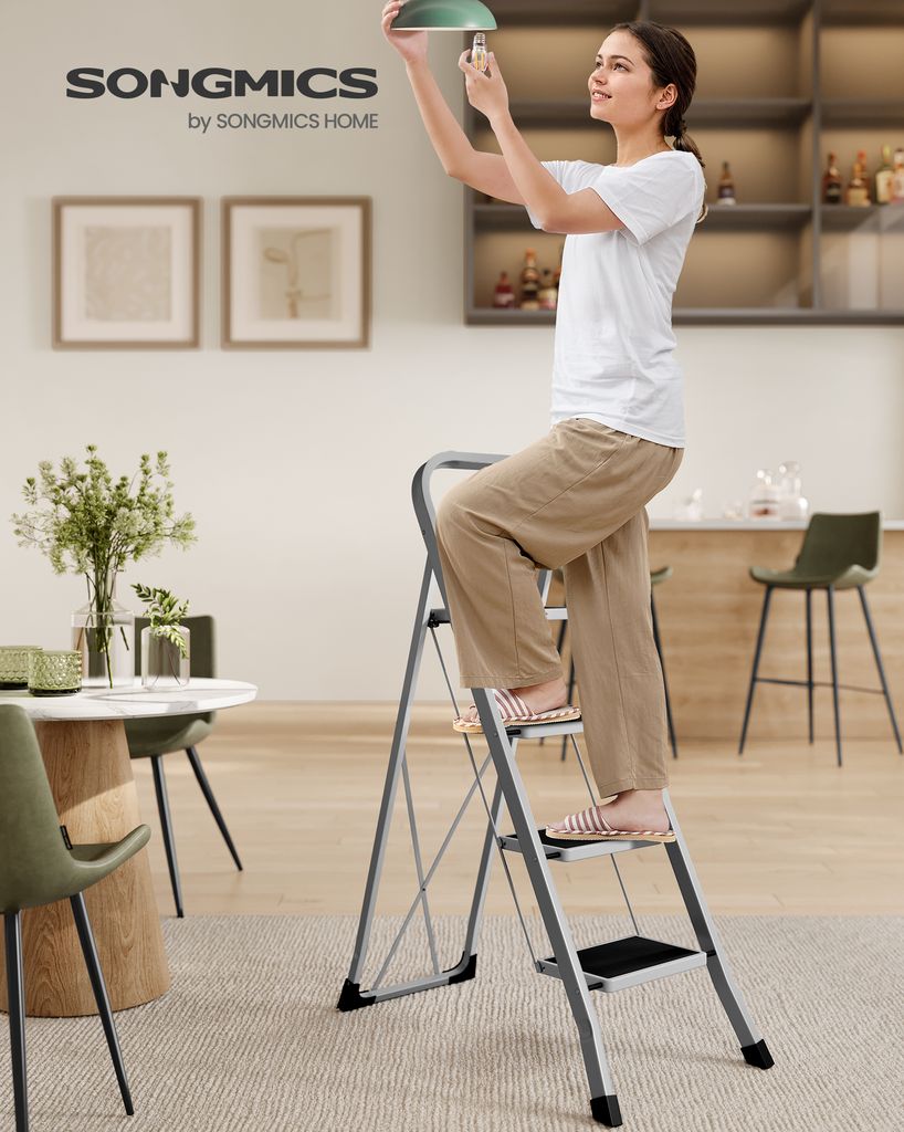 Escalera de paso SONGMICS, escalera de 4 escalones, escalera plegable, cerradura de seguridad, almacenamiento que ahorra espacio, capacidad para hasta 150 kg, gris paloma