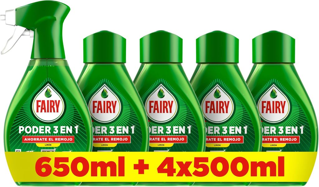 Fairy Pack Poder Sin Remojo Limón Spray 650ml + 4 Recambios 500ml, Antigrasa y Limpieza Rápida para Vajilla y Cocina