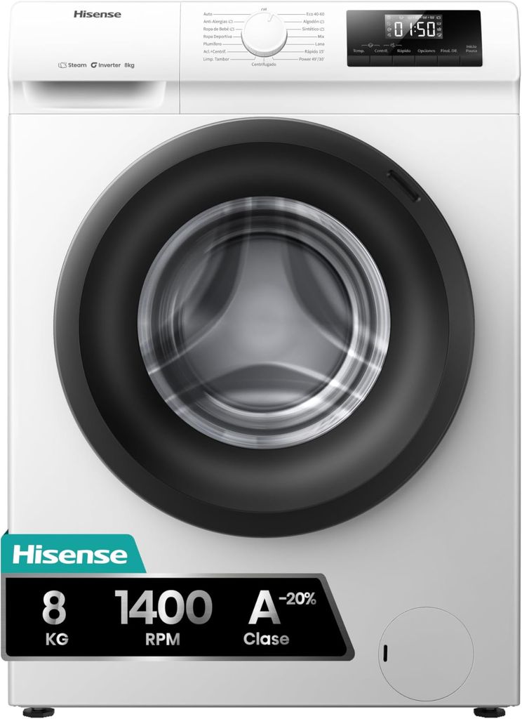 Hisense WF1Q8041BW2 - Lavadora, Clase A, 8 Kg, 1400 rpm, Alto 85 cm x Ancho 60 cm, Color Blanco, Función Vapor 99,9%, Lavado Rápido+, Lavado Automático, Finalización Diferida, Tecnología Inverter