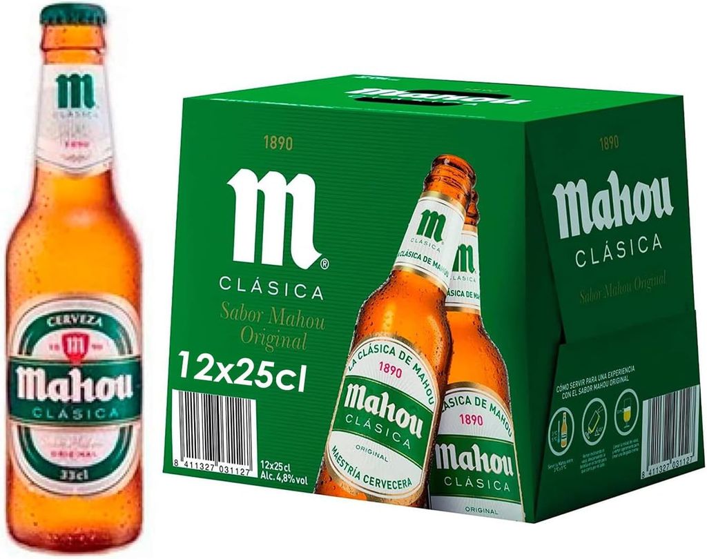 Mahou Clásica, Pack 12 Botellas x 25cl, Cerveza Dorada Lager, Auténtica Cerveza Mahou Con Sabor Suave, Refrescante y Con Espuma Consistente, 4.8% Vol. Alcohol
