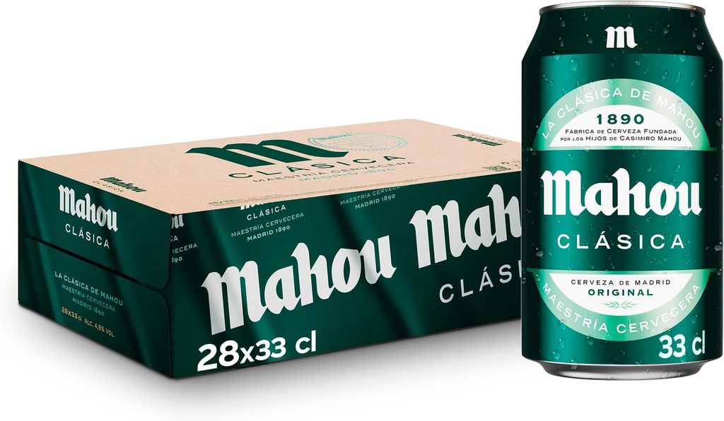 Mahou Clásica, Pack 28 Latas x 33cl, Cerveza Dorada Lager, Auténtica Cerveza Mahou Con Sabor Suave, Refrescante y Con Espuma Consistente, 4.8% Vol. Alcohol