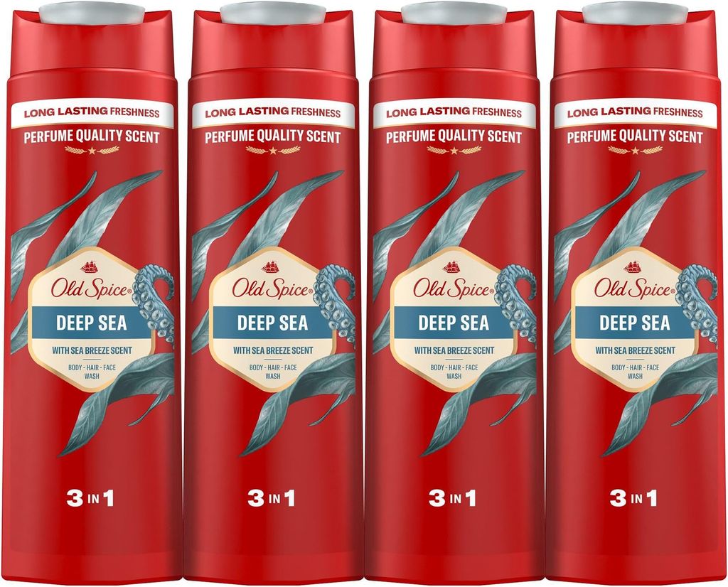 Old Spice Deep Sea Gel De Ducha Y Champú Para Hombres 4x400ml, Gel Para Cara, Cuerpo Y Pelo 3 En 1 Multiusos, Frescura Duradera, Fragancia Excepcional, Limpieza Profunda