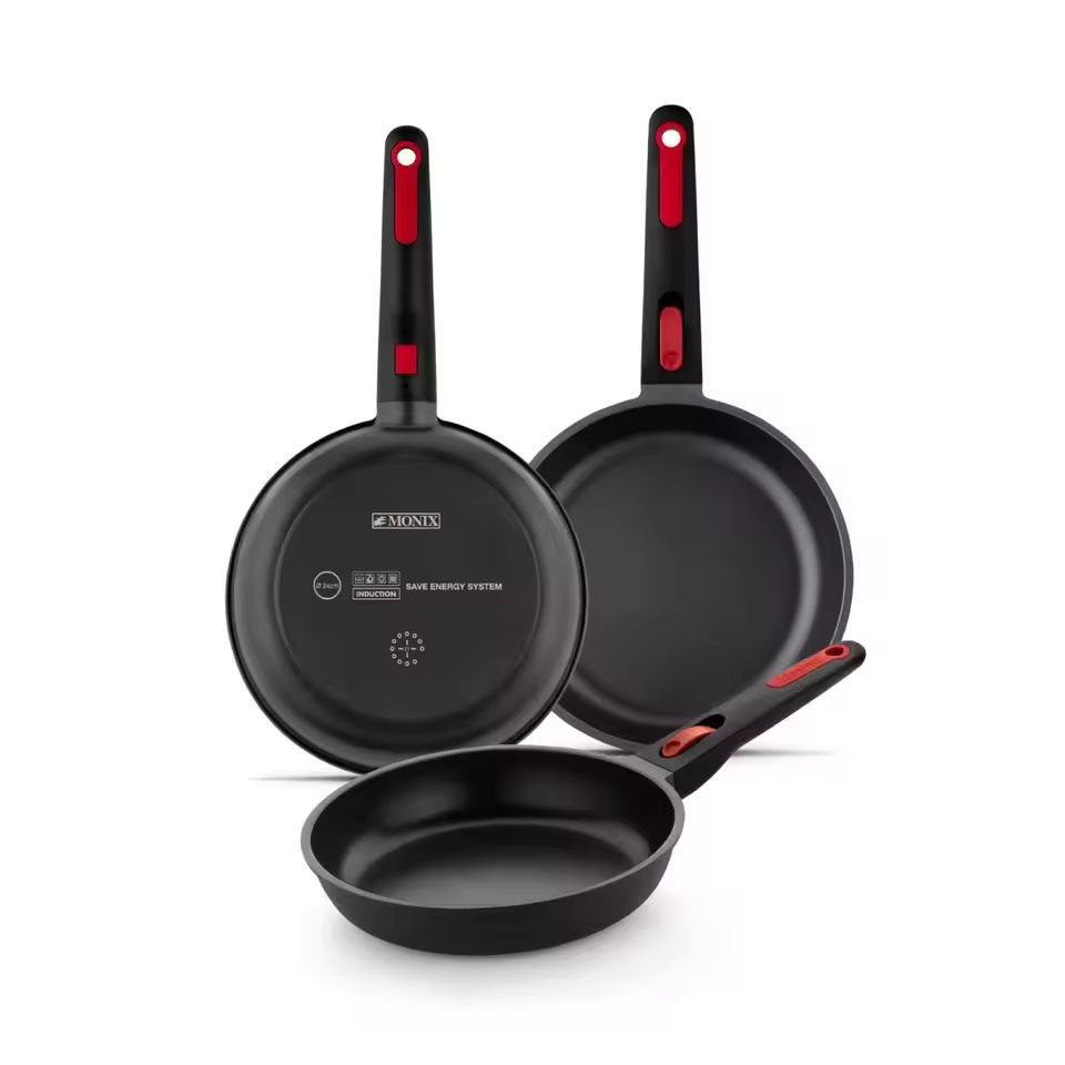 Monix In Out - Set 3 Sartenes Antiadherentes, Lote 18, 22 y 26 cm, Aluminio Fundido, Mango Extraíble y Ergonómico, Utensilio Cocina